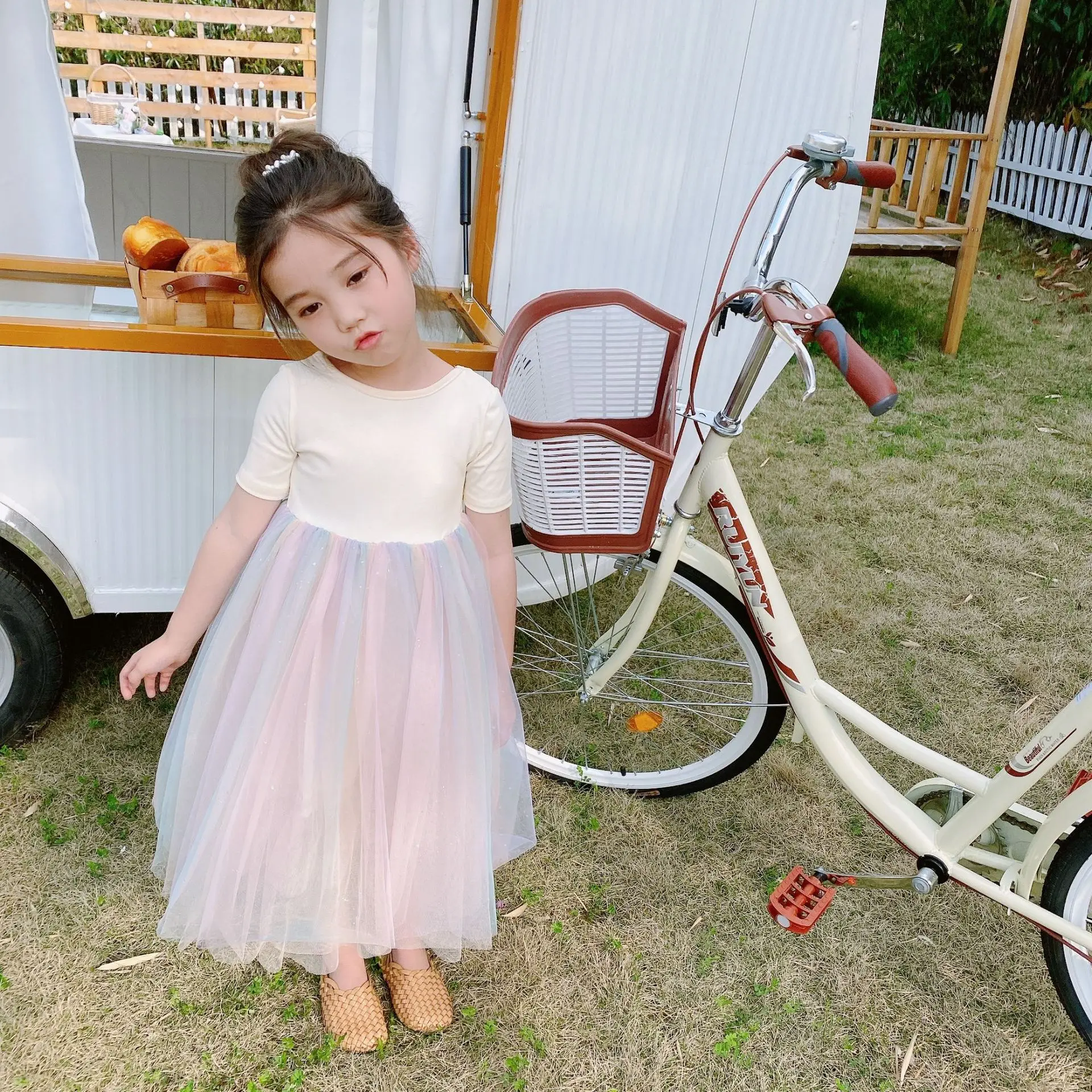 2020 New Style Girls Summer Dress Korean-style Children Baby Girls Mesh Dress Rainbow Tutu Dresses for Sweet Girl Back Cross