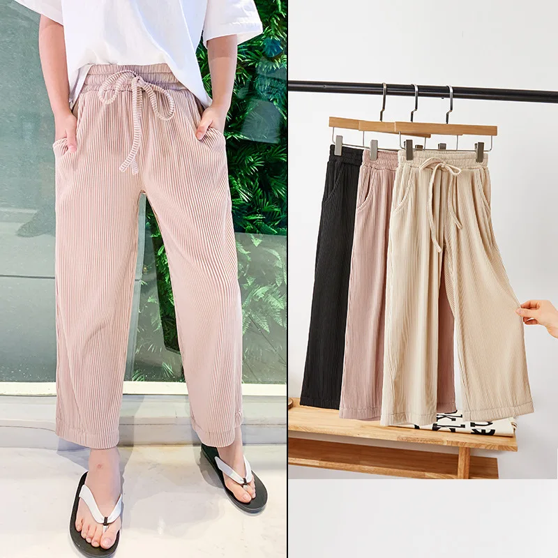 Модные штаны для девочек, прямые свободные штаны в полоску с карманами, летние тонкие штаны для детей, черные, розовые, абрикосовые штаны, 2020