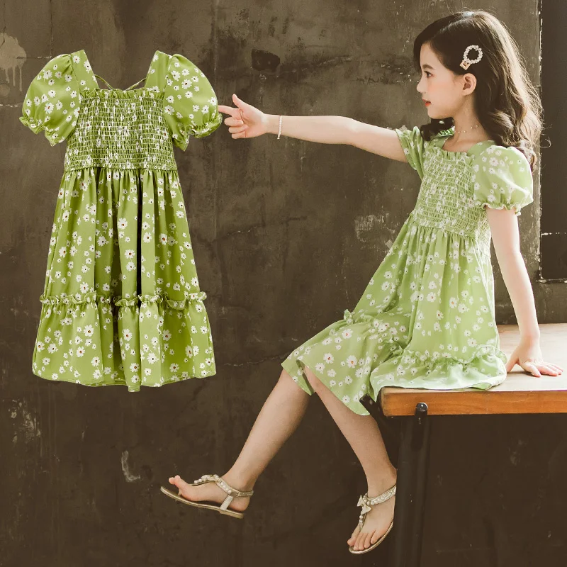 Модные платья с цветочным принтом для девочек, платье с коротким рукавом и открытой спинкой, милое корейское платье, летняя детская одежда, 2020