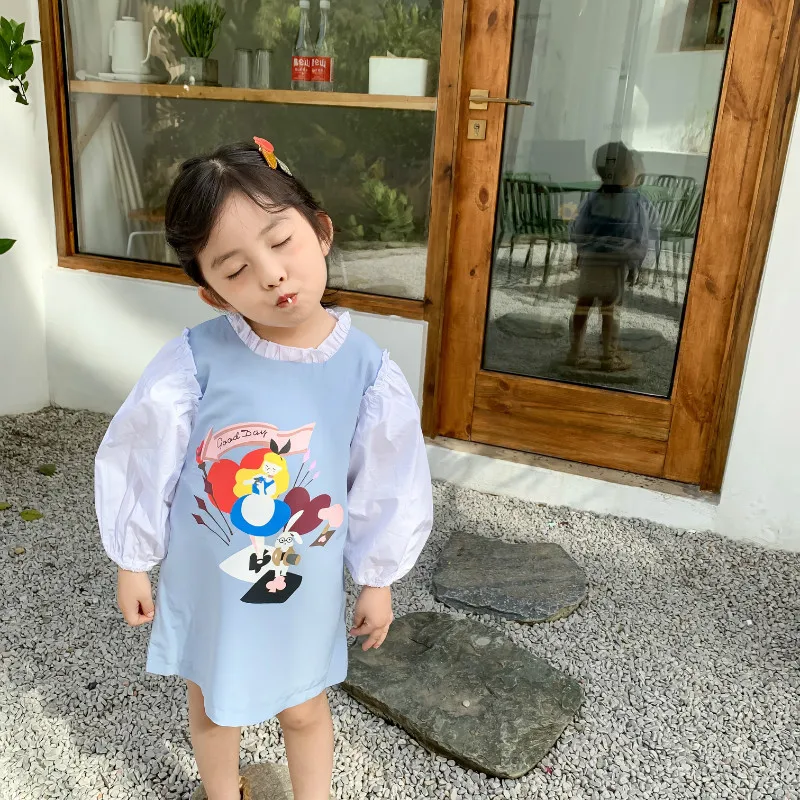 Новое поступление, весеннее хлопковое платье принцессы с длинным рукавом в Корейском стиле, с мультяшным принтом, подходящих цветов для милых модных маленьких девочек