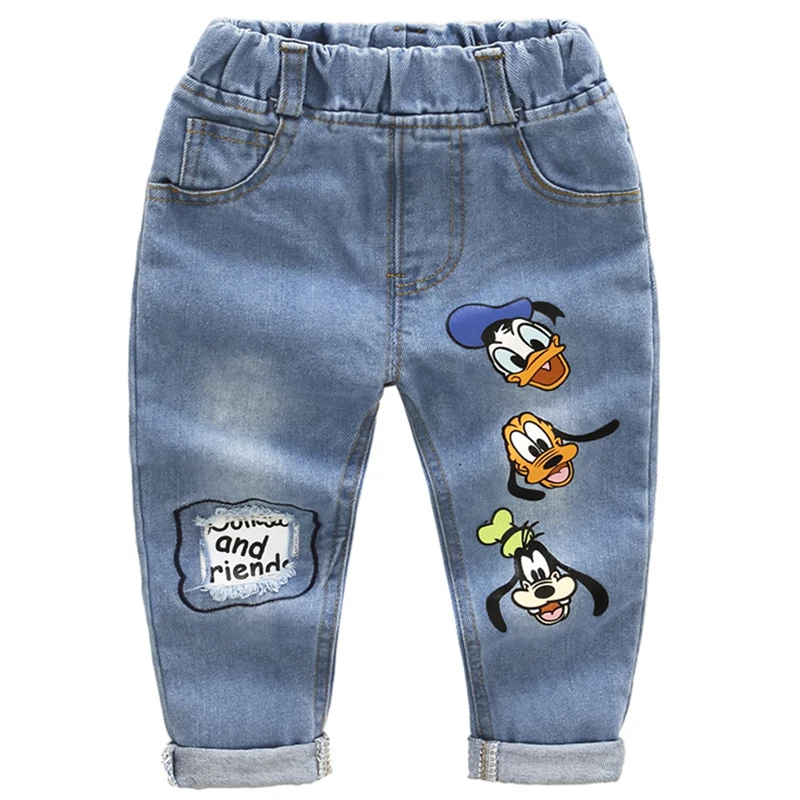 Брендовые Детские джинсы с Дональдом Даком, брюки для мальчиков и девочек, детские рваные джинсы, детские мягкие джинсовые штаны с рисунком,...