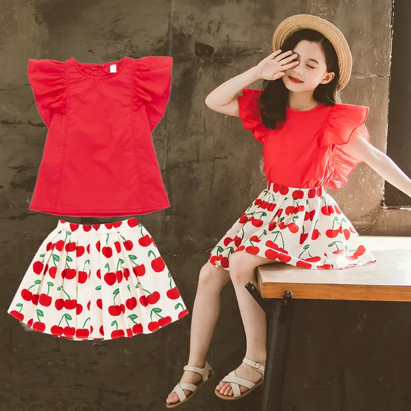 Комплект одежды для девочек; Комплект летней детской одежды; Костюм для девочек с рисунком вишни; Топ с рукавами-крылышками для маленьких девочек + юбка; Детский комплект; 2020