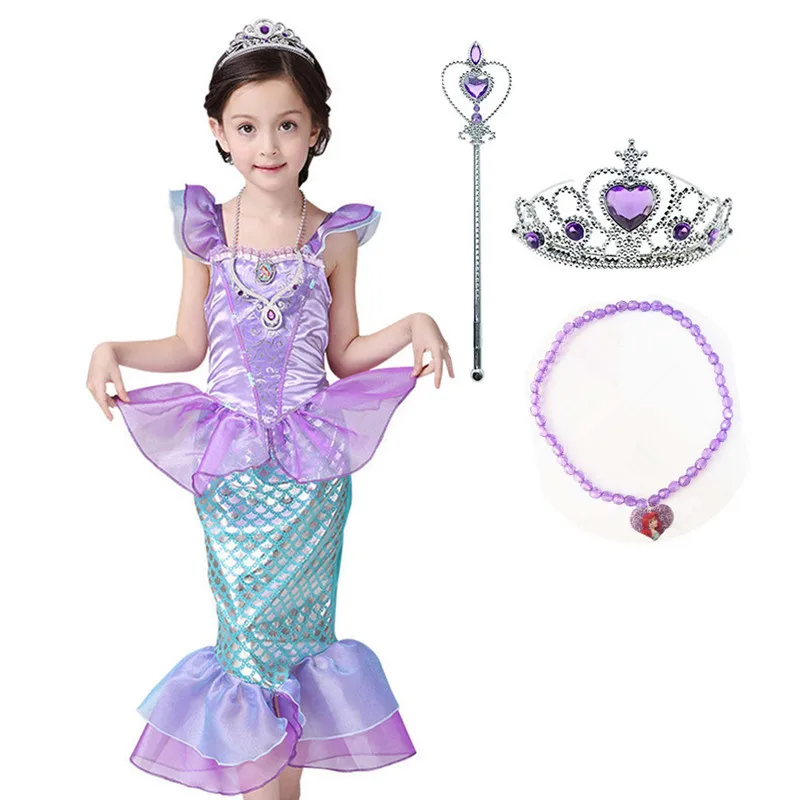 Девушка платье принцессы Русалочка Ариэль костюм для девочек Наряжаться Хэллоуин Русалка Вечерние с короной Цепочки и ожерелья комплект