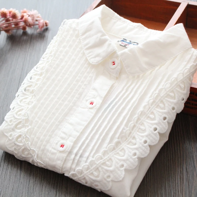 Белая однотонная рубашка для девочек; весенние детские топы; коллекция 2019 года; модные кружевные рубашки с длинными рукавами и оборками; топ...