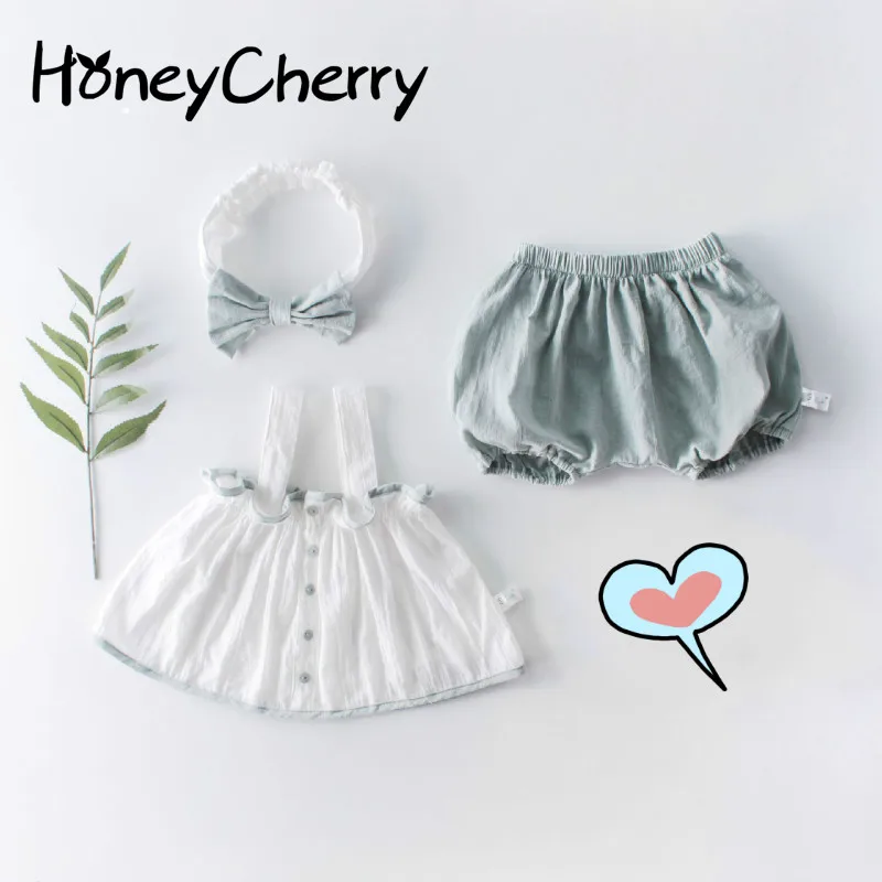 Летняя кнопка для детской одежды, куртка без рукавов на бретельках + шаровары + повязка для девочки, костюм из трех предметов летняя одежда д...