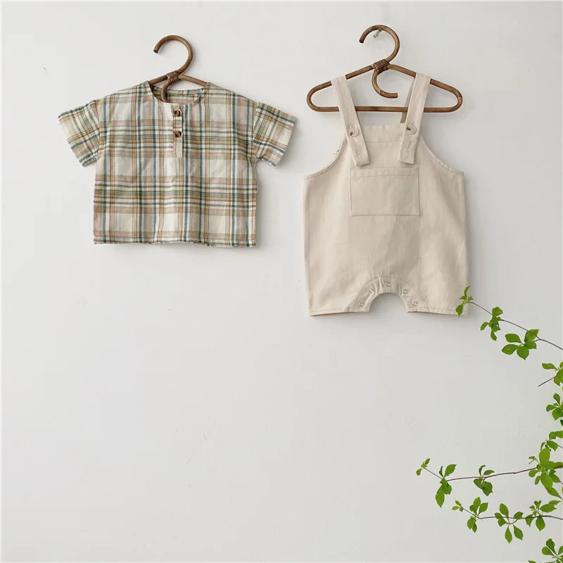 3443 Children's Wear Baby Round Neck Short Sleeve Plaid Shirt Denim Strap Shorts Pants Two Piece Suit Boy Clothing Set Kids