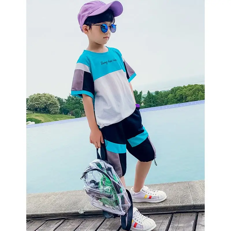 Комплект одежды для мальчиков-подростков; летние топы с короткими рукавами; Детский костюм в стиле пэчворк; корейский комплект для подростков; От 4 до 14 лет