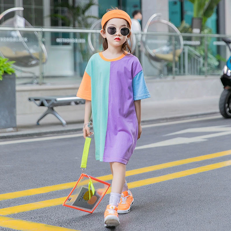 Летняя хлопковая длинная футболка для девочек-подростков Повседневная футболка в Корейском стиле, в стиле пэчворк Модная Детская короткая футболка #8781