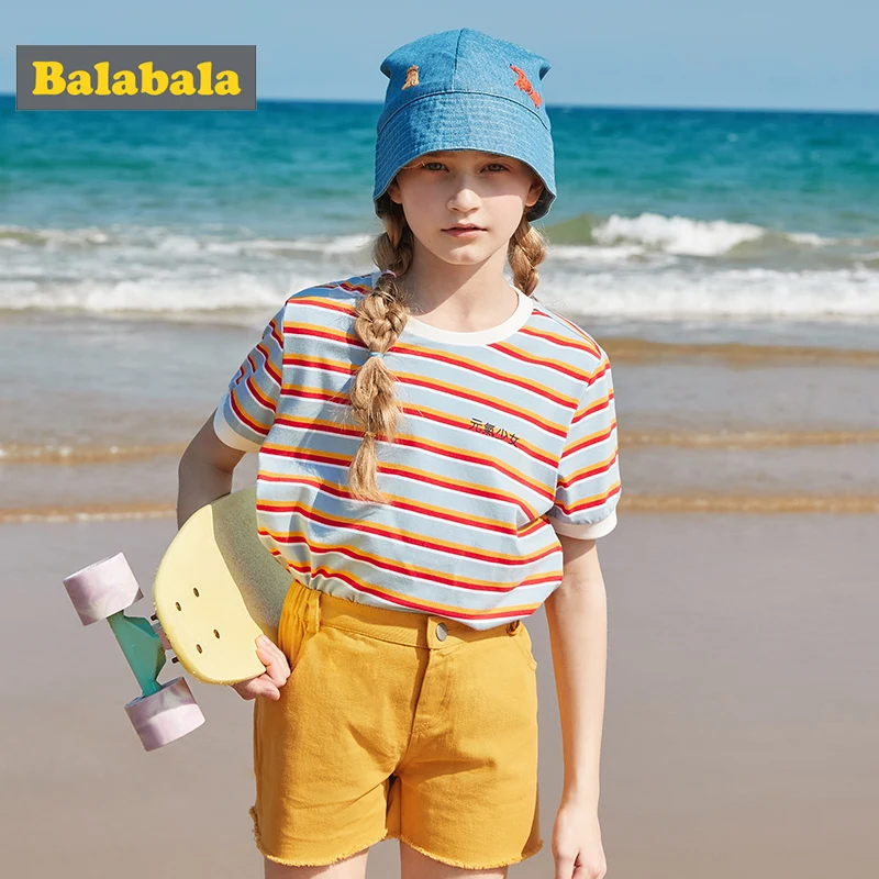 Balabala/футболка с короткими рукавами для девочек; Сезон лето; Новинка 2020 года; Милая модная футболка из хлопка с круглым вырезом и эластичной резинкой для маленьких принцесс