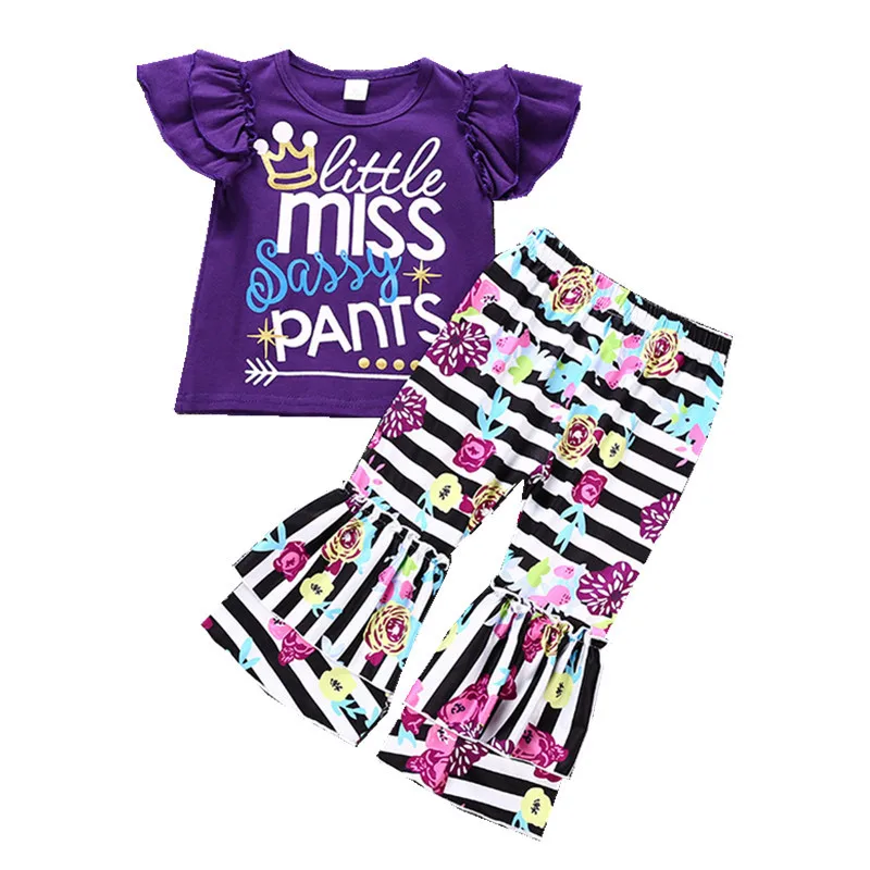 Детская одежда для малышей, комплект из 2 предметов, Топ реглан с блестками и рюшами + расклешенные штаны, летняя одежда для маленьких девоче...