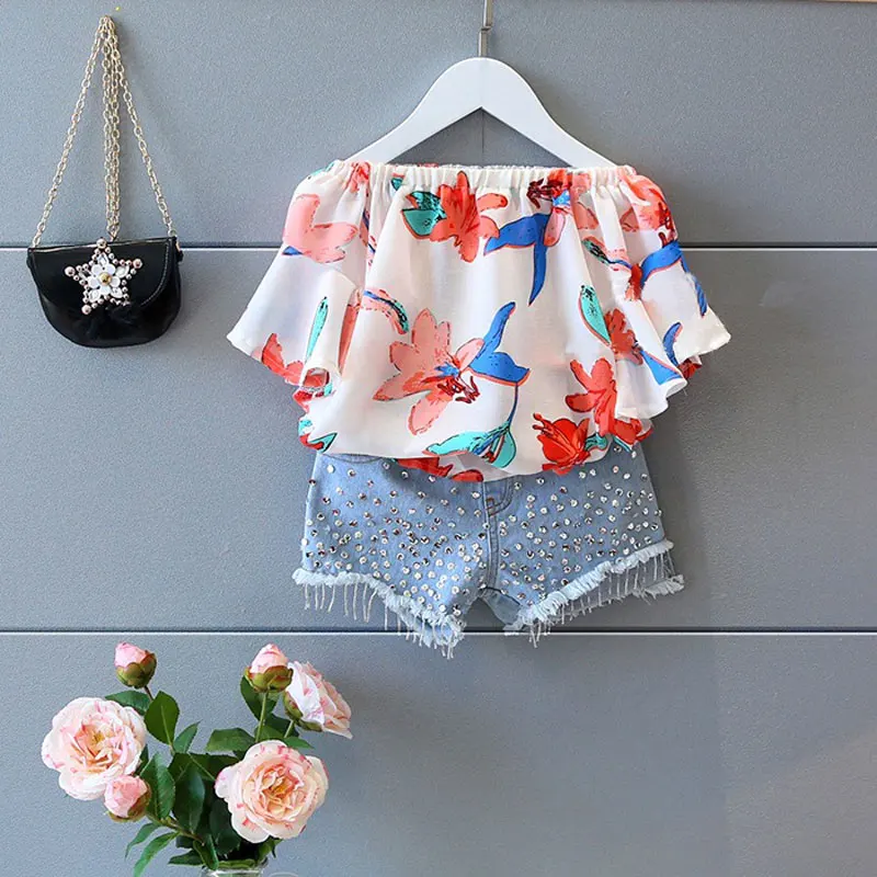 2019 комплект одежды для девочек, шифоновая блузка и джинсовые шорты, комплект из 2 шт./компл., модная рубашка с воротником без бретелек, Детски...