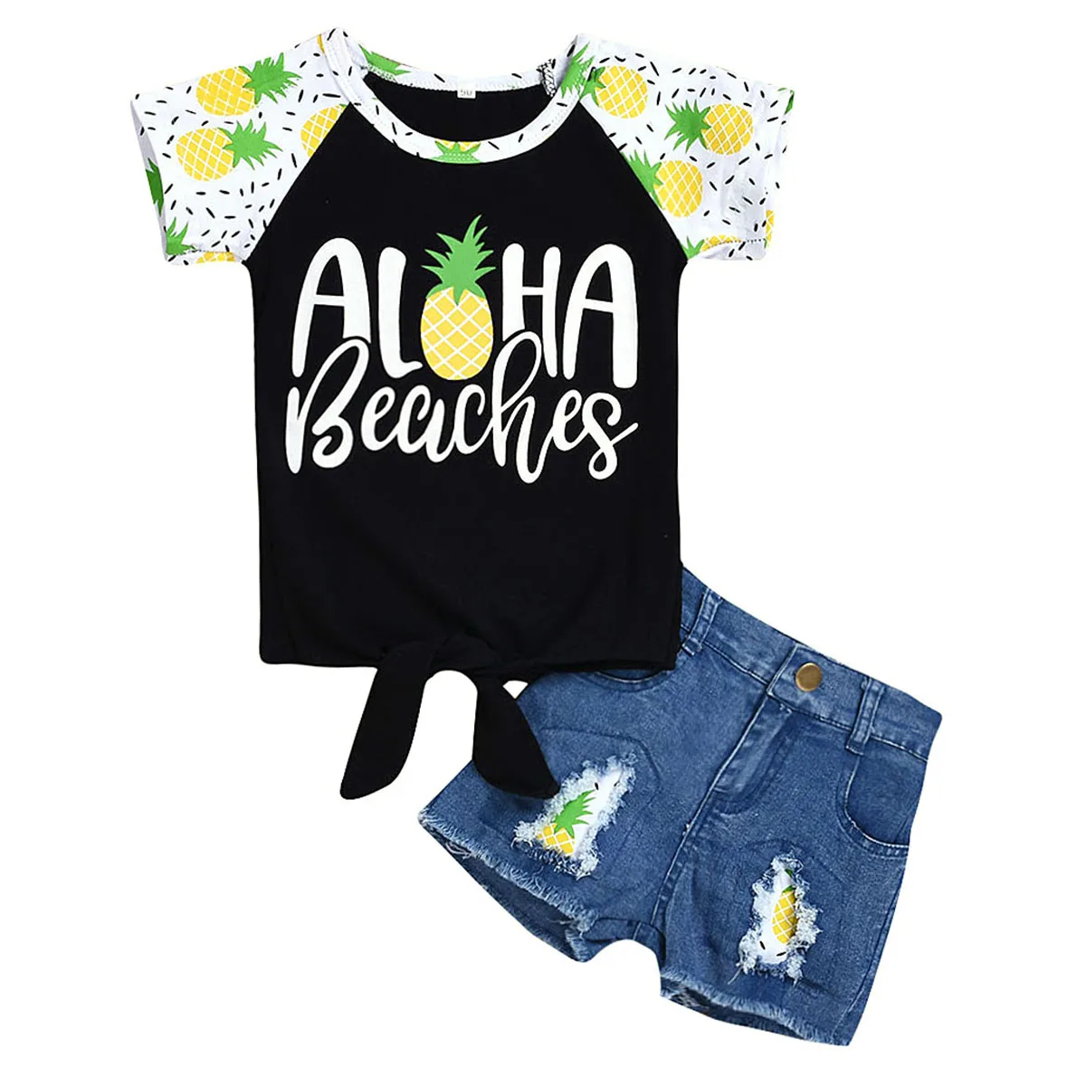 Модный комплект из 2 предметов для маленьких девочек Летняя футболка с короткими рукавами топ + шорты комплект джинсовой одежды с принтом ан...