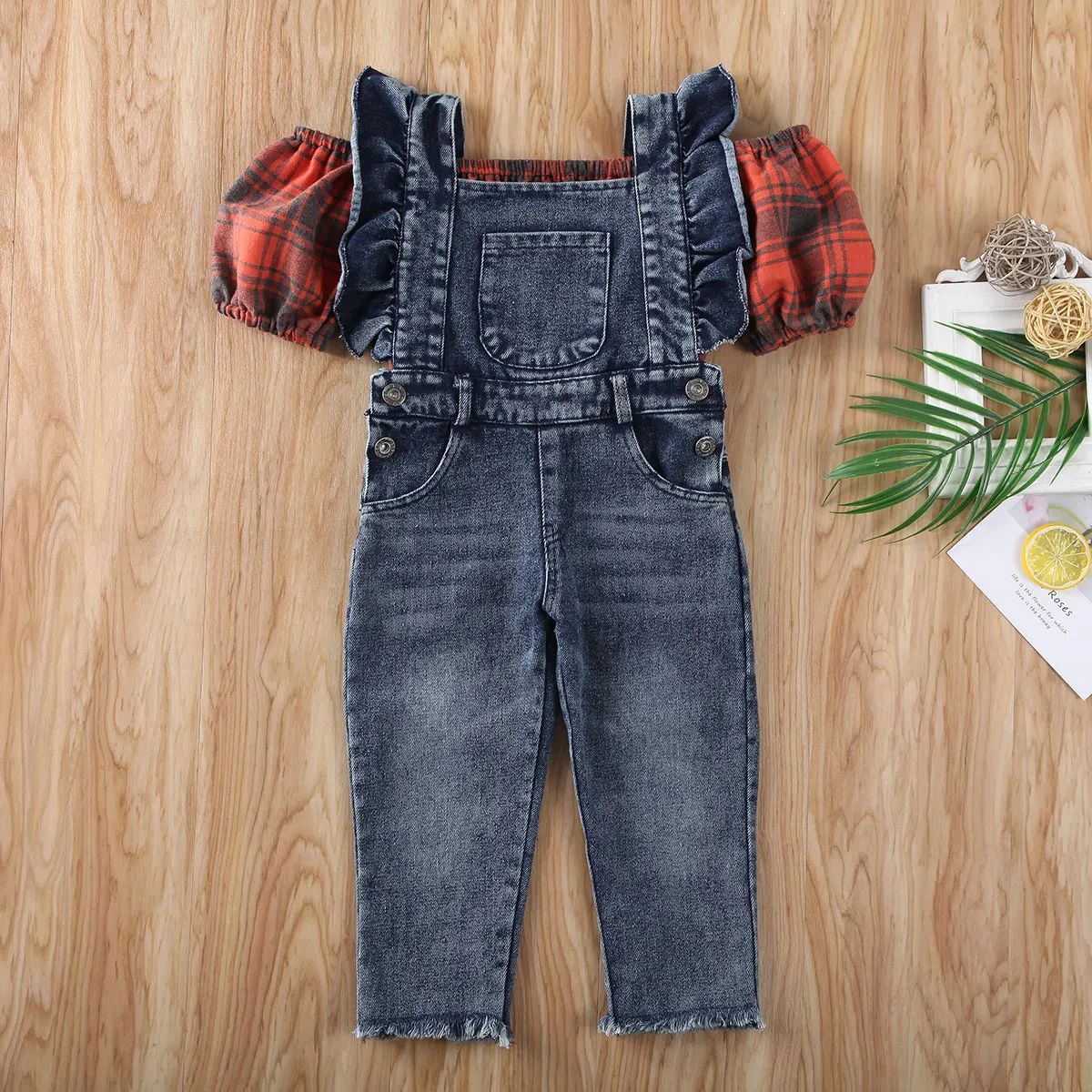 Pudcoco/Одежда для маленьких девочек; укороченные топы в клетку с открытыми плечами; джинсовый комбинезон без рукавов с оборками; комбинезон; комплект из 2 предметов; комбинезоны