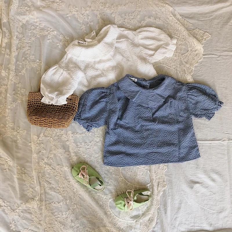Рубашка для маленьких девочек на шнуровке с воротником «Питер Пэн», 2020 новые летние детские блузки с рукавами-пузырьками, топы, повседневная одежда для детей 1-6 лет