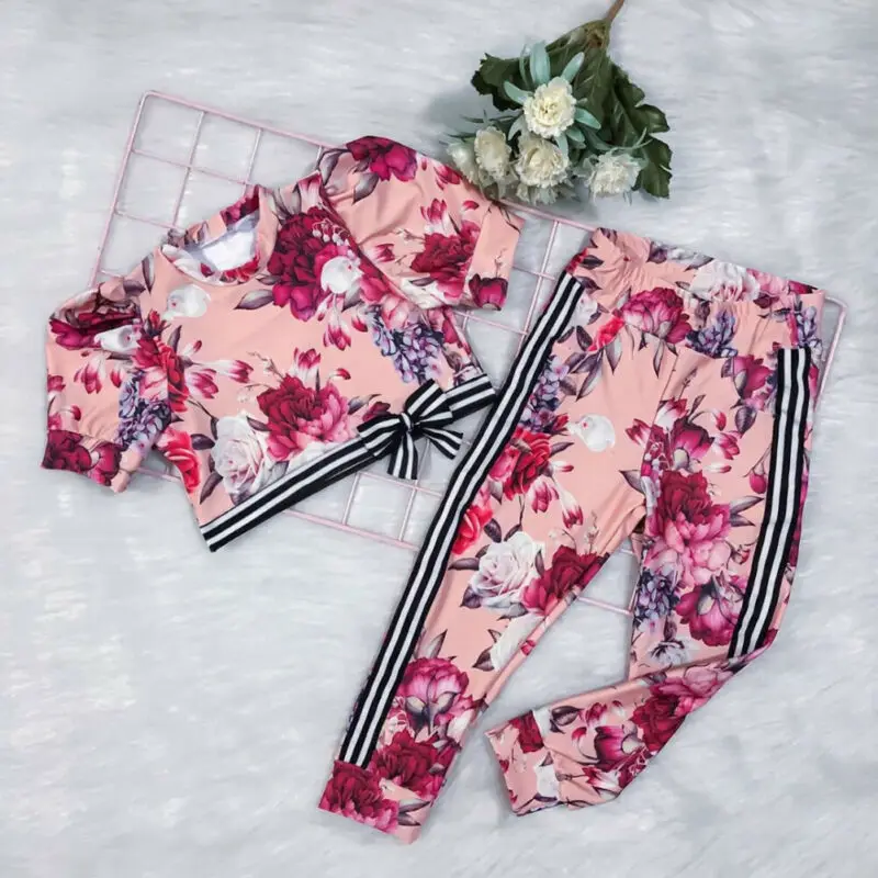 CANIS детская одежда для маленьких девочек одежда с цветочным принтом короткий рукав с цветочным принтом; Топы с бантом Полосатые штаны; костюм с леггинсами