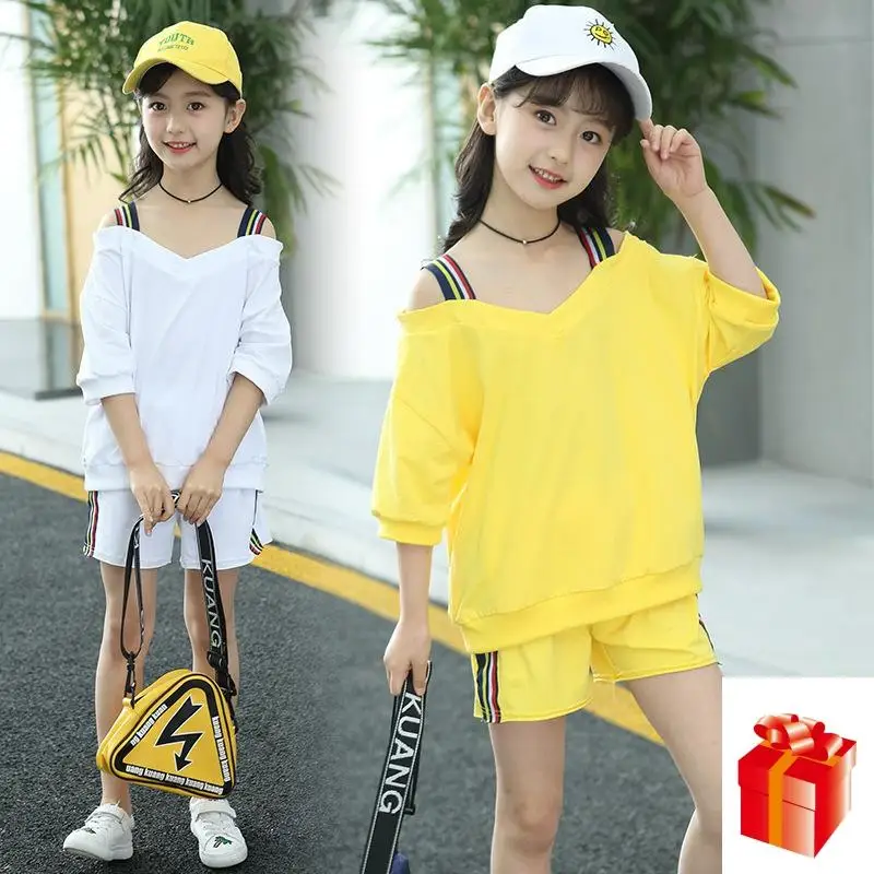 Детские комплекты одежды для девочек, новый летний костюм, однотонный топ на подтяжках + Шорты, модный спортивный костюм из двух предметов д...
