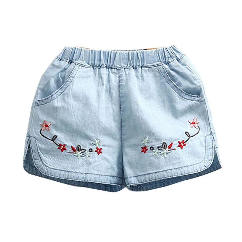 2020 Популярные летние повседневные джинсовые шорты синего цвета с вышитыми цветами и карманами для маленьких девочек 2, 3, 4, 6, 8, 10 лет