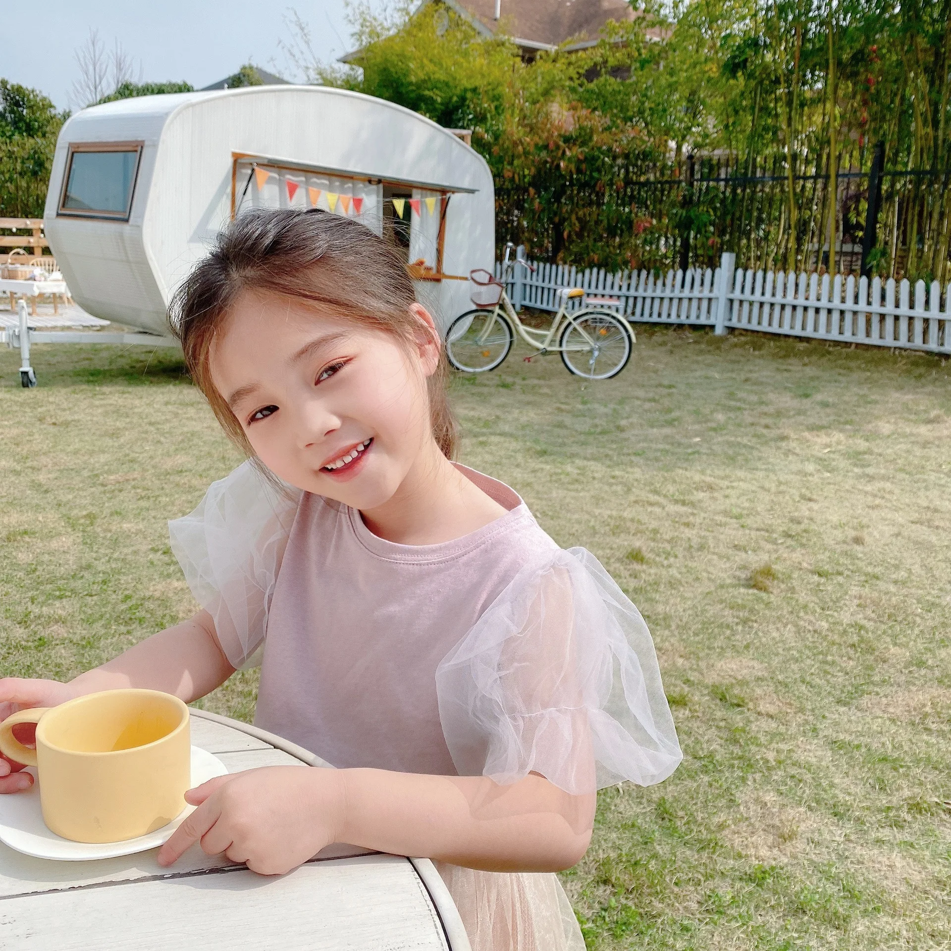 2020 г. Летняя новая стильная футболка с короткими рукавами для девочек Детская Хлопковая льняная Футболка с рукавами-фонариками и вырезом лодочкой цвета макаруна