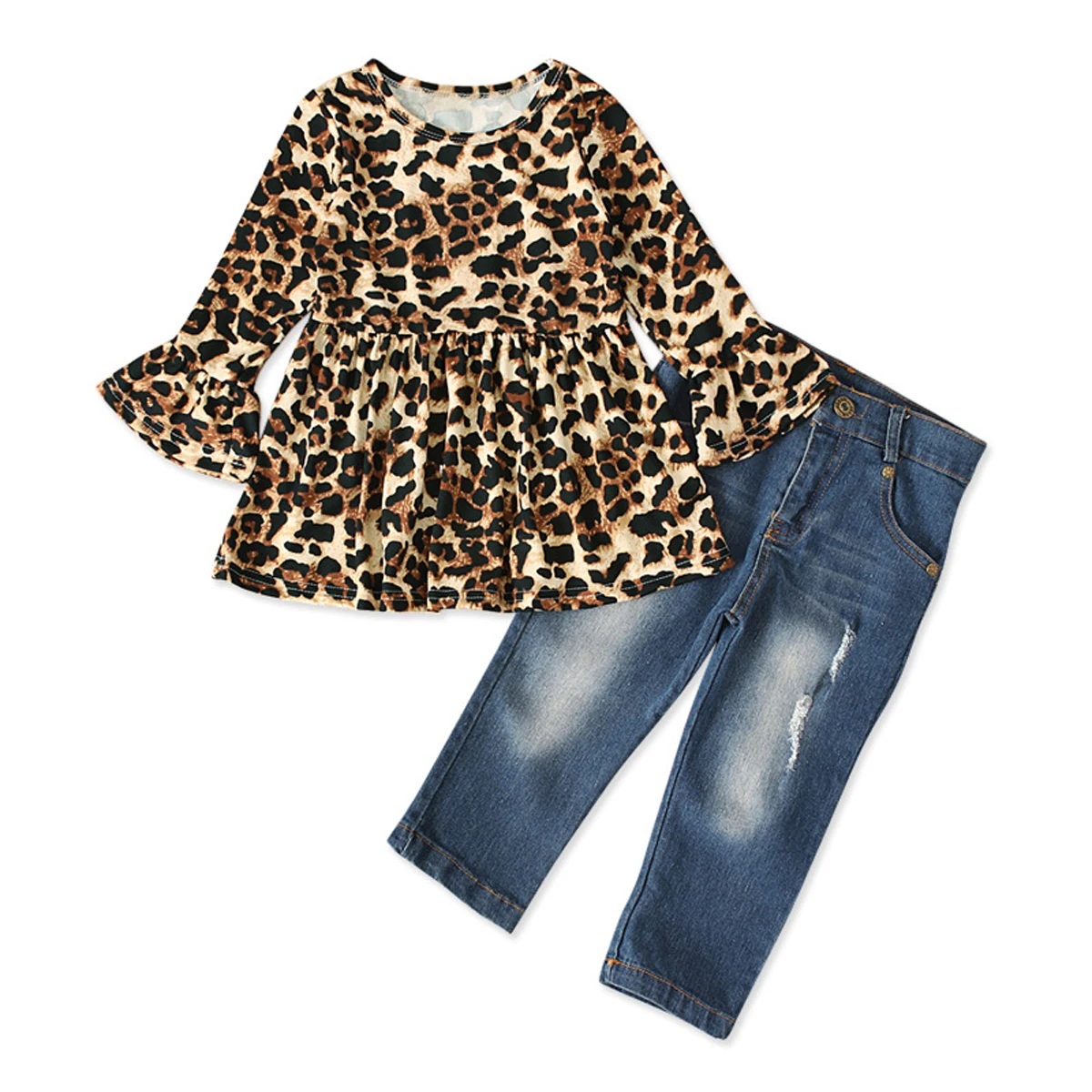Комплекты детской одежды из 2 предметов для маленьких девочек От 2 до 7 лет топы с леопардовым принтом и рюшами на рукавах + джинсы джинсовые штаны комплекты летней одежды
