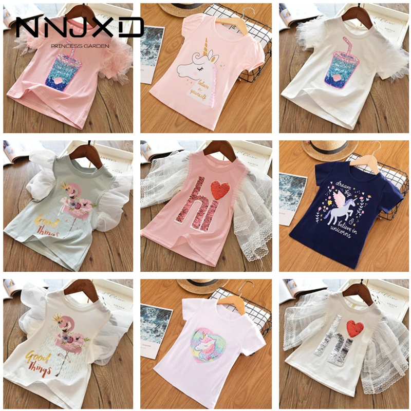 Летние футболки с короткими рукавами для девочек топы с рисунком фламинго, единорога, одежда для маленьких девочек Футболка с блестками для малышей от 3 до 8 лет