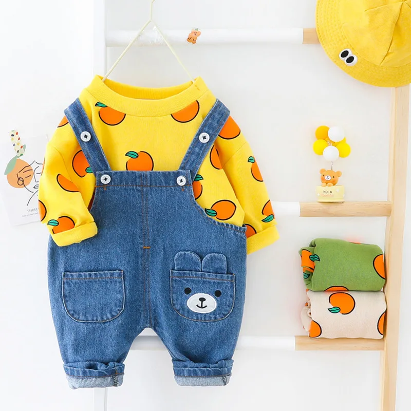 Весенне-Осенняя детская одежда; Спортивный костюм; Повседневный свитер для маленьких мальчиков и девочек; Джинсовый комбинезон; 2 шт./компл.; Хлопковая детская одежда с рисунком для малышей