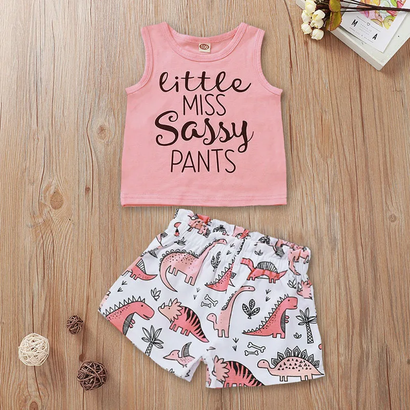 2020 г. Розовая одежда комплект одежды из двух предметов для девочек брюки с надписью «Little Miss» топ с принтом и шорты с динозавром летний детский комплект с шортами
