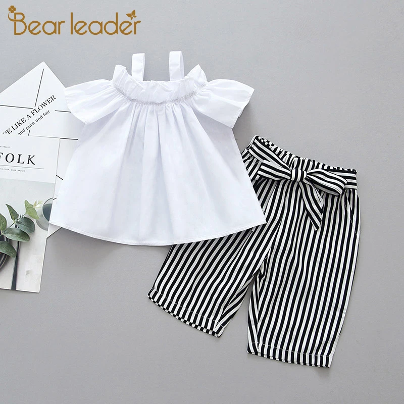 Bear Leader/Детские комплекты, 2020 Новая модная белая футболка для девочек и штаны в полоску, детская повседневная одежда, летняя верхняя одежда