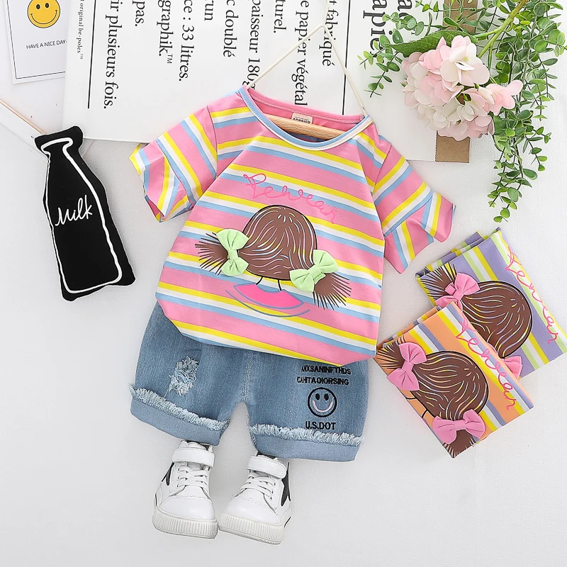 HYLKIDHUOSE/летние комплекты одежды для маленьких девочек, 2020 г. Футболка в полоску с короткими рукавами джинсовые шорты Повседневная одежда для маленьких детей