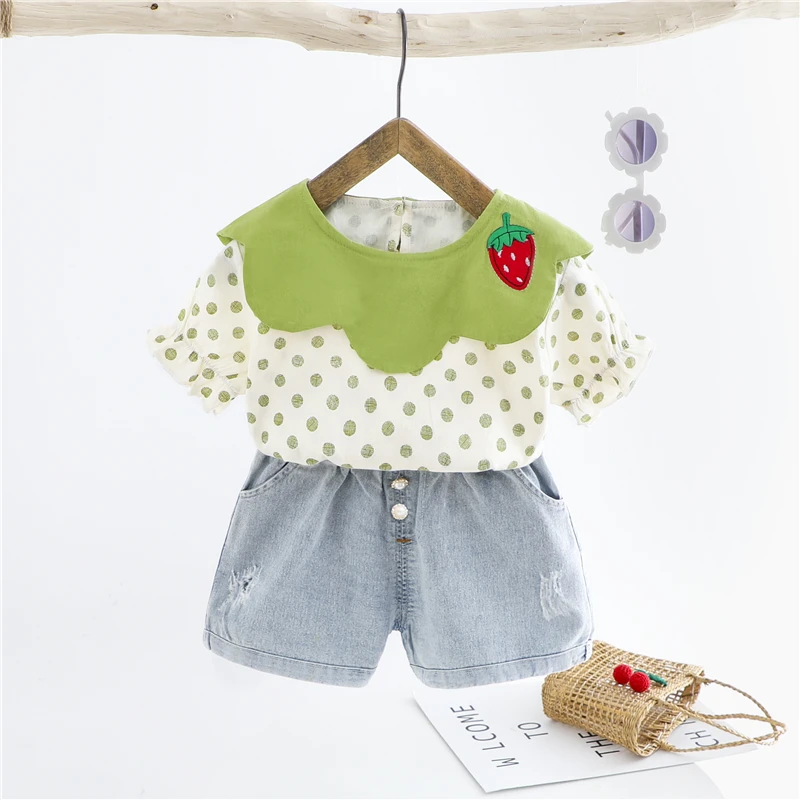 HYLKIDHUOSE 2020 Summer Baby Girls Clothing Sets Short Sleeve Strawberry Lace T Shirt Shorts Infant Children Vacation Clothes