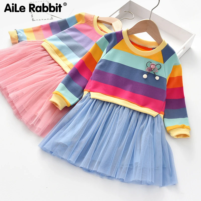 Новое поступление 2020 года; платья для девочек Весенняя детская одежда в полоску с длинными рукавами ярких цветов радуги пышные вечерние платья принцессы