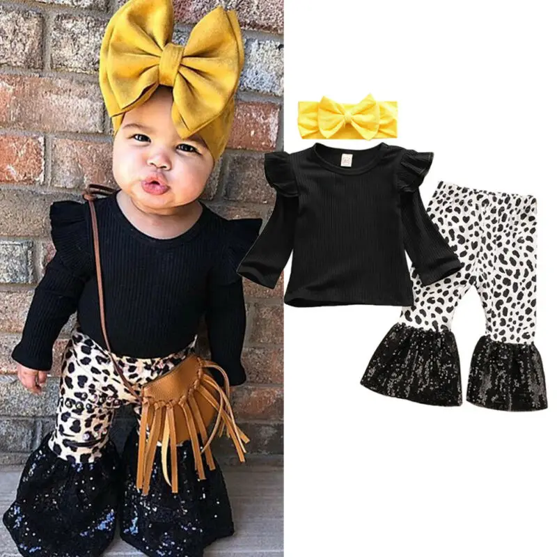 Emmababy комплекты зимней одежды для маленьких девочек, вязаные топы с длинными рукавами, расклешенные штаны с леопардовым принтом, повязка на ...