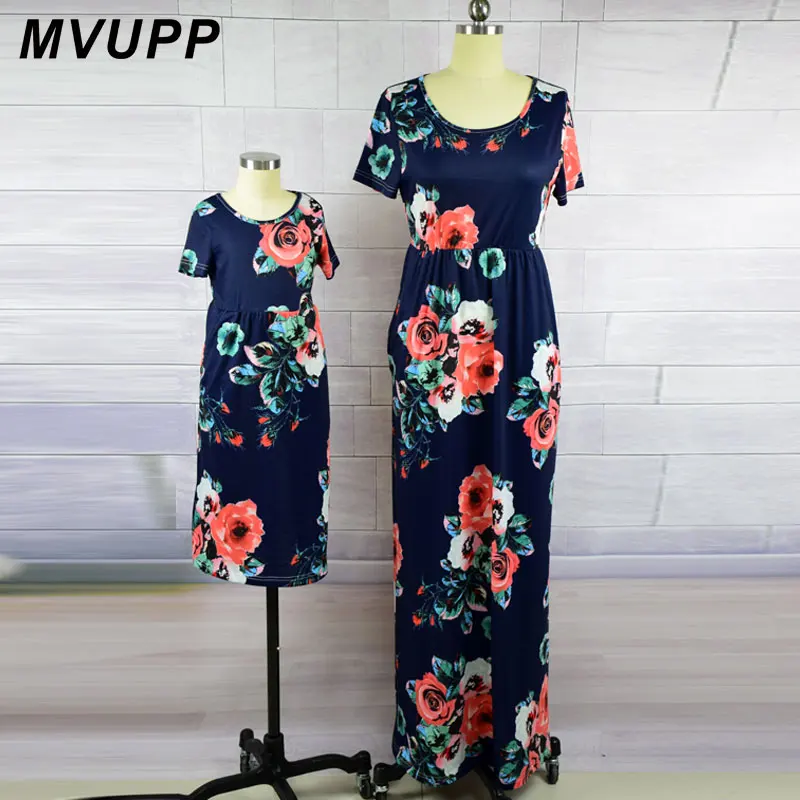 MVUPP/платья для мамы и дочки, Модный цветочный принт, короткий рукав, одежда «Мама и я», одинаковые комплекты для семьи, платье до щиколотки