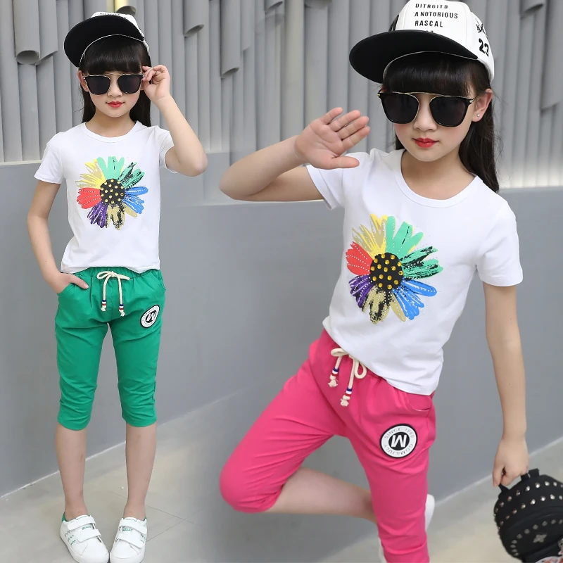 Девочек Лето 2018 Новый стиль костюм 6 т-рубашка + шорты 7 одежда для девочек 8 детей 2 шт комплект 9 Tide 10-для детей 12 лет