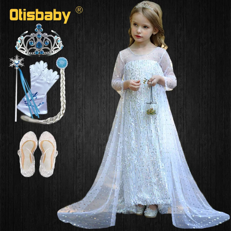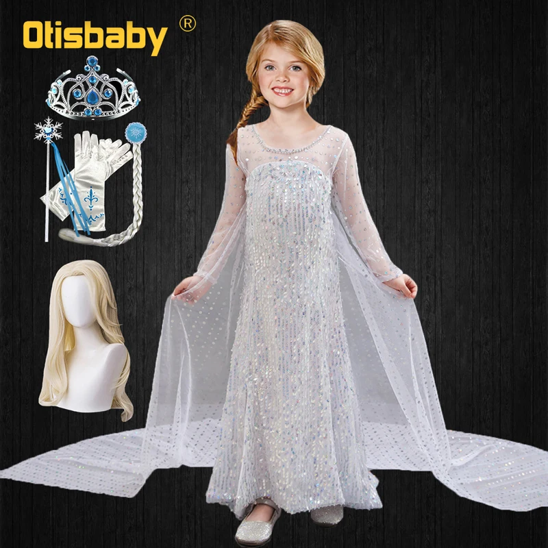 Снежная королева Эльза 2 платье для девочек Хэллоуин Карнавал косплей костюм белый блестками Длинные платья Дети взрослых свободные волосы...