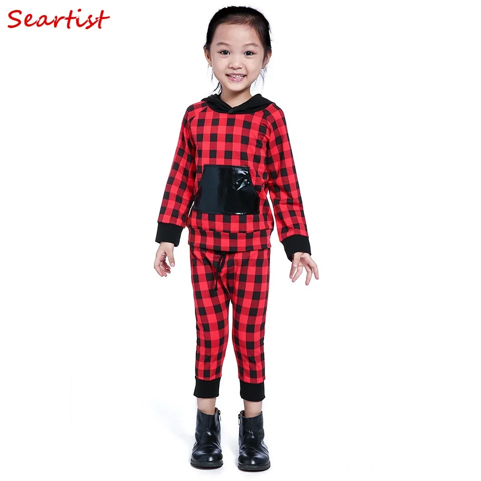 Seartist/Рождественский комплект одежды для маленьких мальчиков и девочек, Bebe, красная клетчатая Толстовка + штаны, детский пуловер с капюшоном и костюм для бега, детская одежда, 45