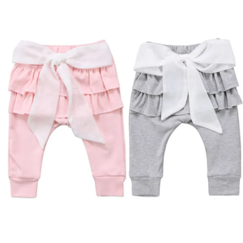 Кружевные брюки с воланами и бантом для новорожденных девочек; осенние Многослойные повседневные штаны из хлопка; розовый и серый цвет