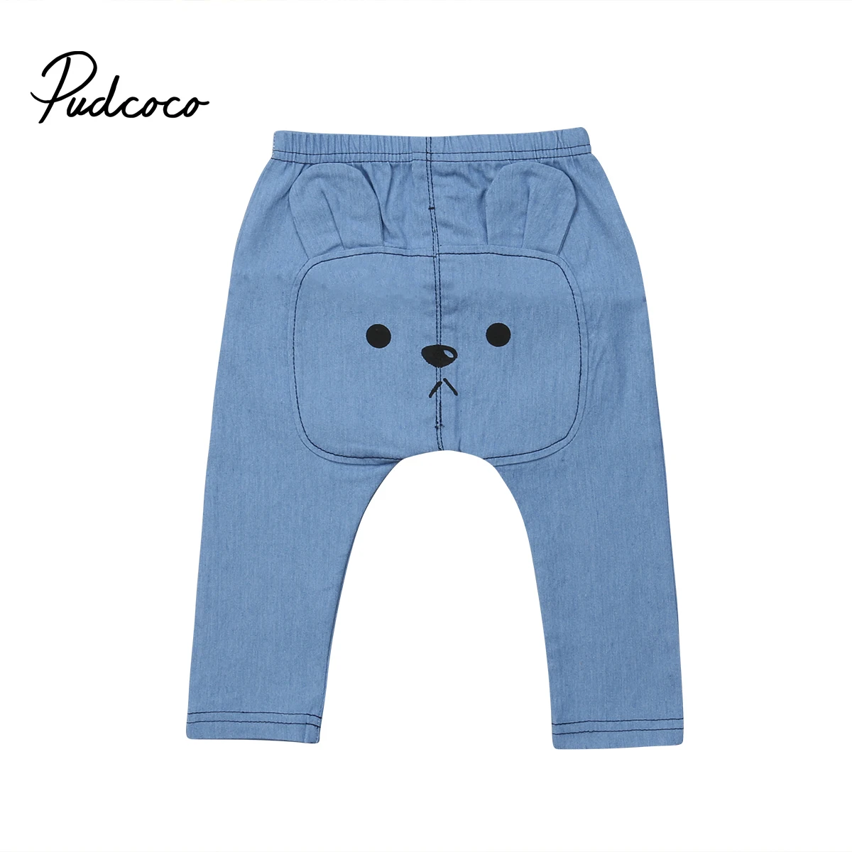 Милые осенние длинные голубые джинсы для маленьких мальчиков и девочек штаны-шаровары с медведем Леггинсы Брюки