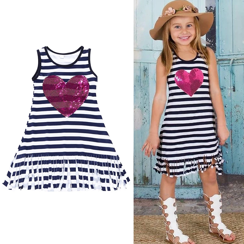 Платье в полоску для девочек 2019 г., детское красное платье без рукавов с блестками и кисточками для маленьких девочек летний сарафан в стиле ...
