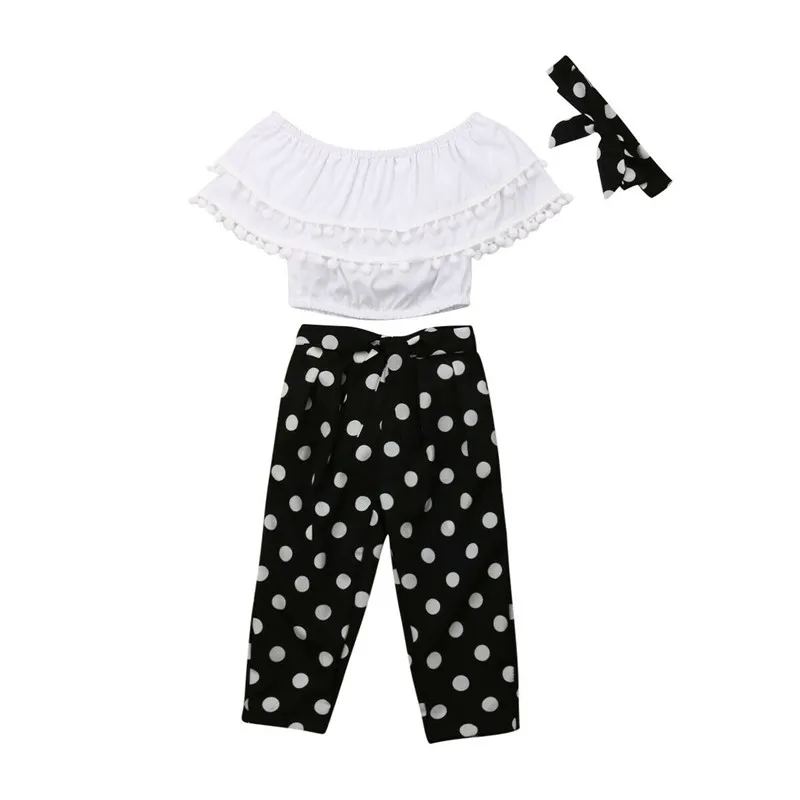 От 2 до 7 лет, на лето дети для маленьких девочек ретро 3 шт наряды шифон с открытыми плечами Топы рюшами Короткие топы с кисточками штаны в гор...