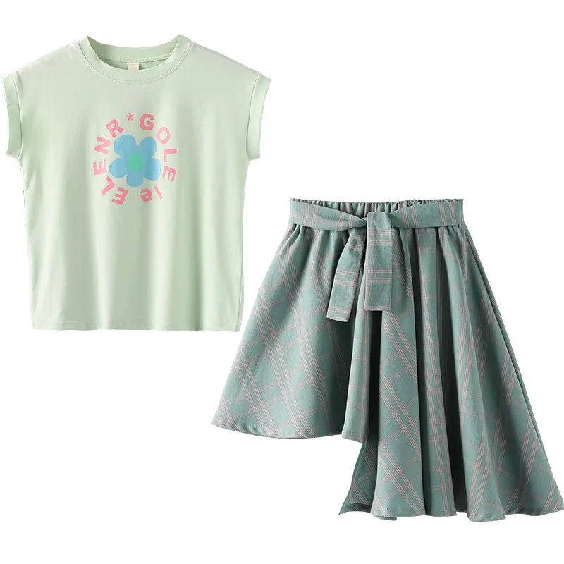 2020 летний модный детский комплект из 2 предметов для девочек-подростков, Повседневная футболка и клетчатая юбка, милый комплект одежды для маленьких девочек #8747