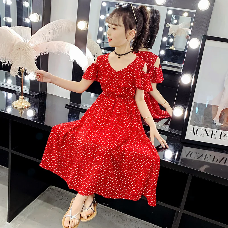 Платье принцессы для девочек-подростков, летнее пляжное платье в горошек из шифона для путешествий, в богемном стиле, Детские платья для девочек, одежда, костюм для детей 12, 13 лет