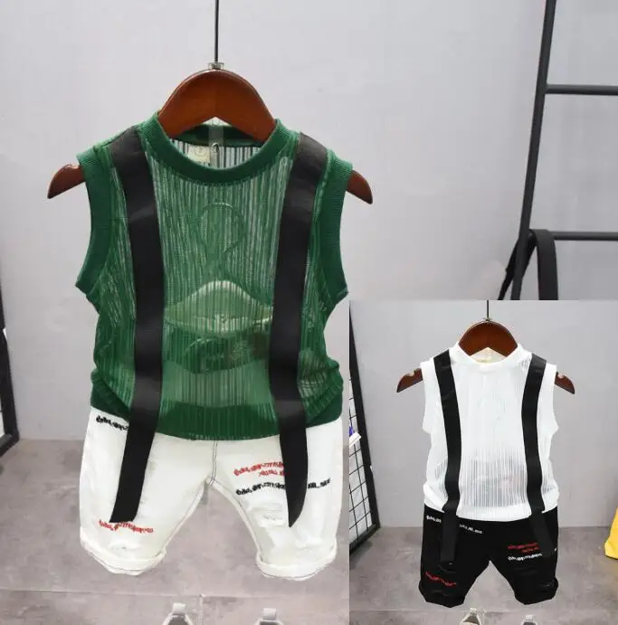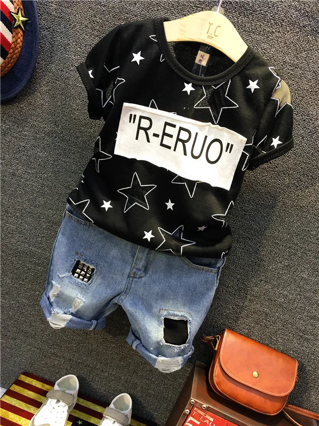 2018 новые летние комплекты одежды для мальчиков, детские топы с геометрическим рисунком для мальчиков, футболка + рваные джинсовые шорты, спо...