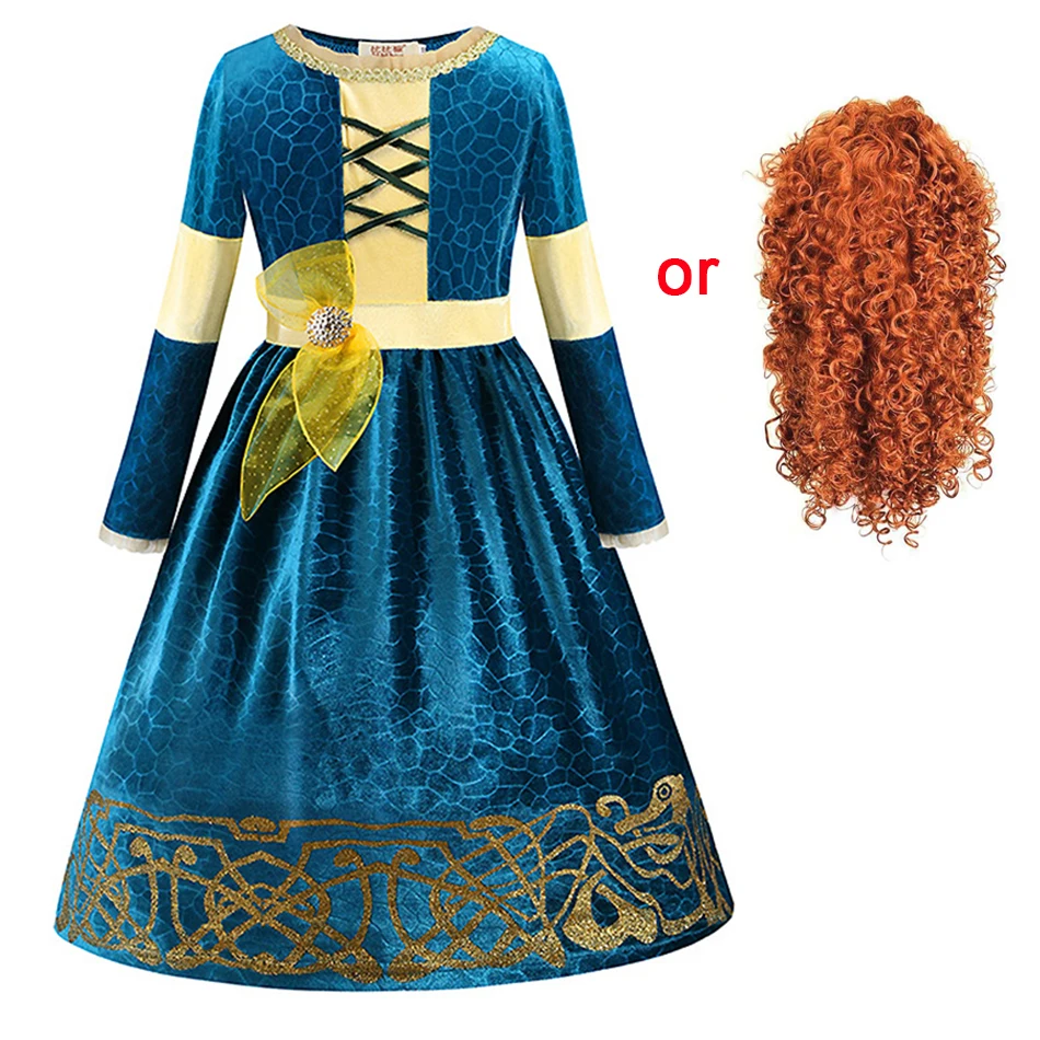Для девочек, смелая Принцесса Мерида, платье, костюмы, дети, длинный рукав, зима, косплей, праздничная одежда, костюм Мериды, парик, нарядное п...