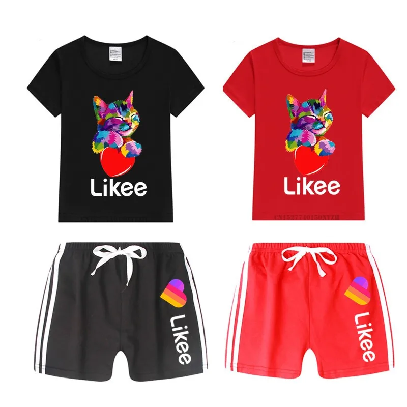 Забавная футболка с мультипликационным принтом «Likee» для мальчиков и девочек Детский комплект с шортами, Детские Топы + штаны, комплекты одежды с изображением кота Прямая поставка