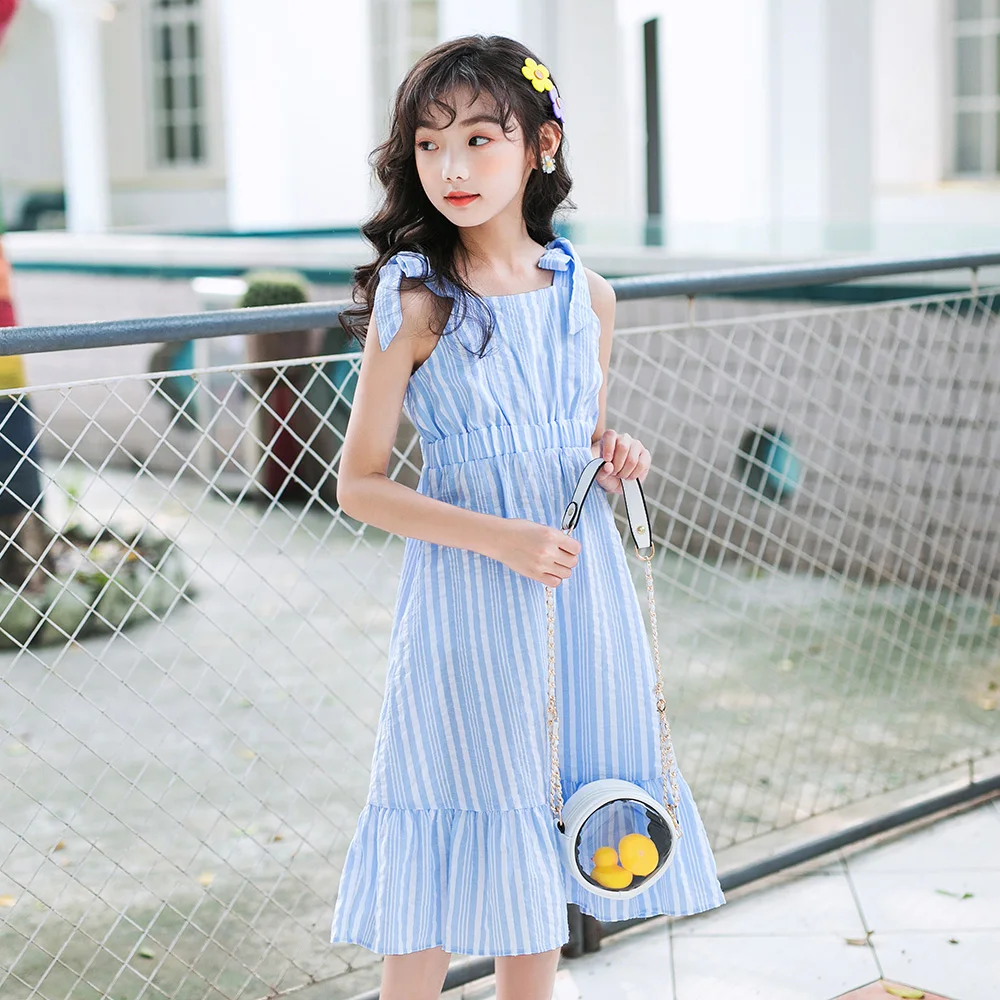 Новинка 2020 года; летние хлопковые платья для девочек; Детские Полосатые платья на бретелях для девочек-подростков; модные платья без рукавов для маленьких девочек; #9074