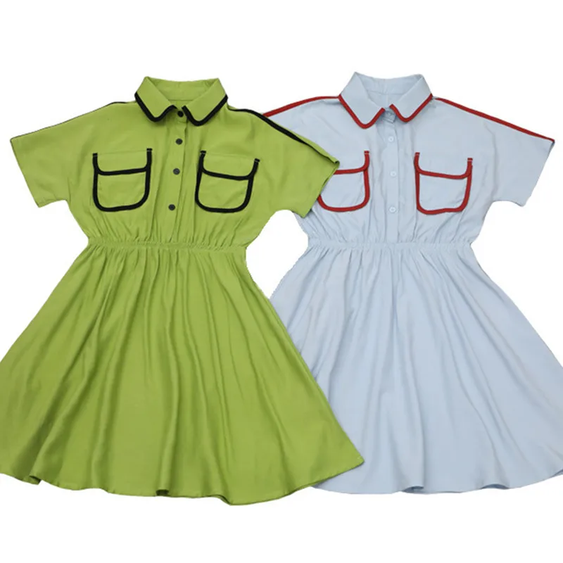 Летнее повседневное расклешенное платье-рубашка с двумя передними карманами для девочек-подростков от 4 до 16 лет модное платье с отложным воротником для девочек