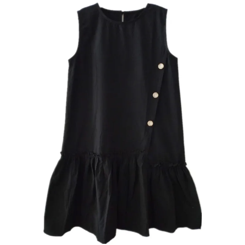 Летнее хлопковое повседневное расклешенное платье с оборками для девочек от 3 до 12 лет Детское модное однотонное платье-майка без рукавов на пуговицах для девочек