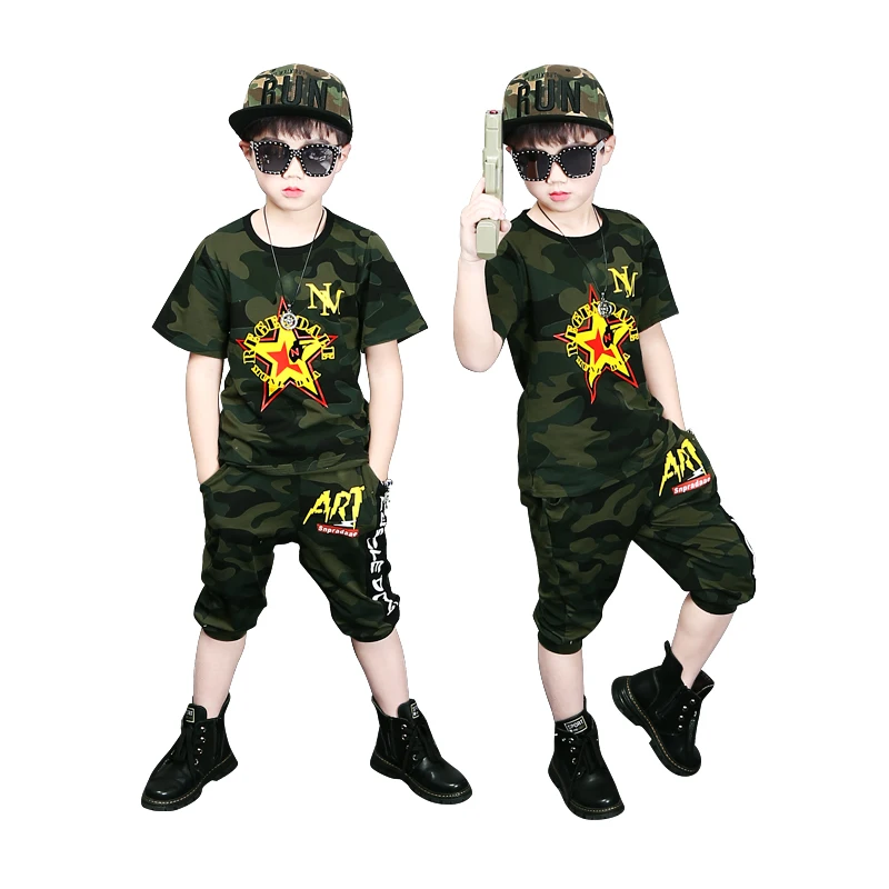 Детская футболка с коротким рукавом и мультяшным принтом, комплект из топа и камуфляжных штанов, одежда для маленьких мальчиков