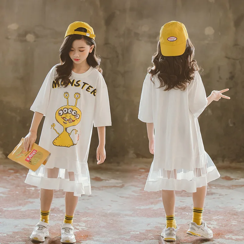 Летнее Повседневное платье для девочек-подростков; длинная рубашка с принтом с героями мультфильмов; детское Хлопковое платье в стиле пэчворк с оборками; Одежда для девочек 10-12 лет