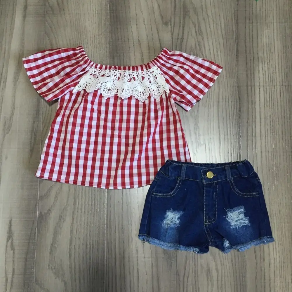 Одежда для маленьких девочек, клетчатые комплекты, джинсовые шорты, Красный Клетчатый Топ, детская одежда
